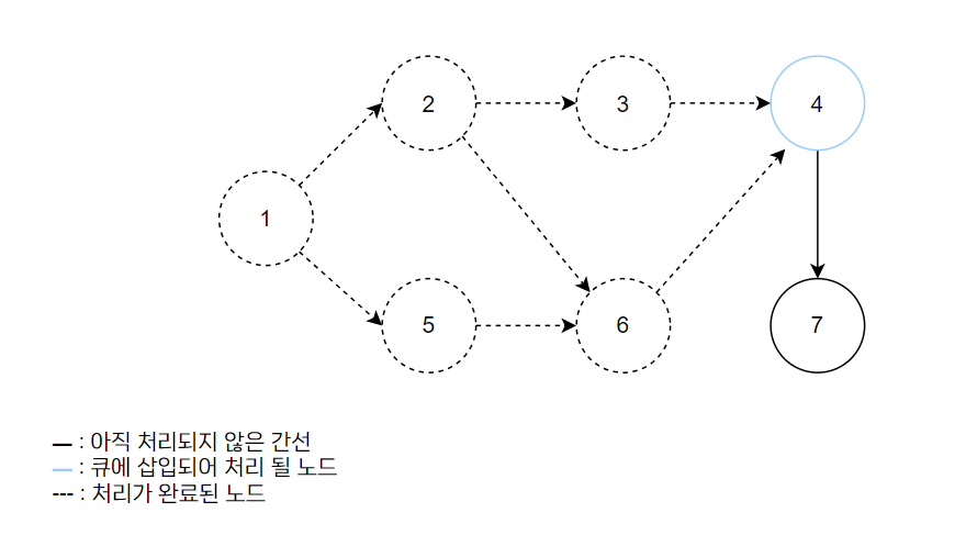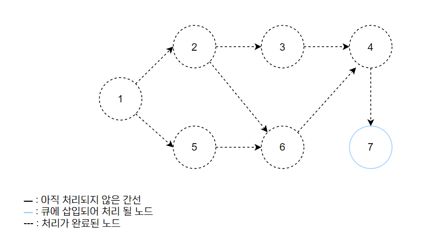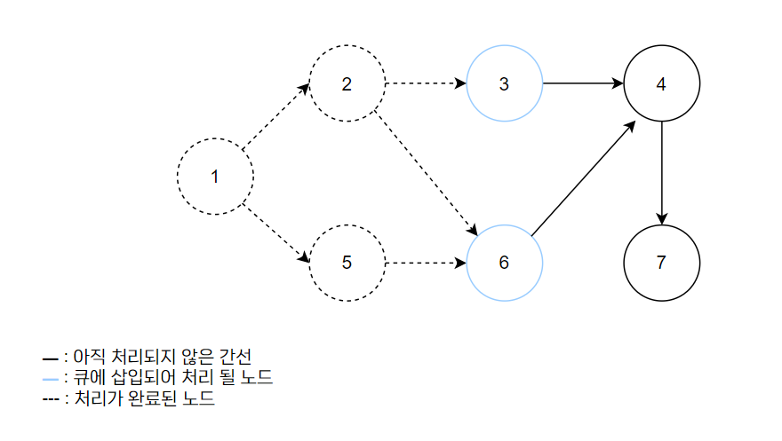 - 위와 동일한 로직으로 큐에 있는 노드를 꺼내고, 꺼낸 노드와 연결되어 있는 간선들을 제거한다.